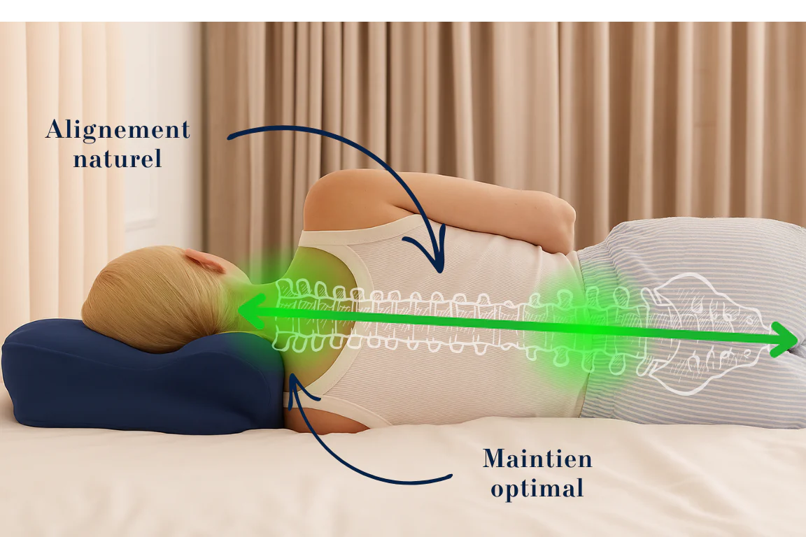 Un oreiller ergonomique conçu pour respecter l’alignement naturel de votre corps, apaiser les tensions et vous offrir un sommeil profond et véritablement réparateur.